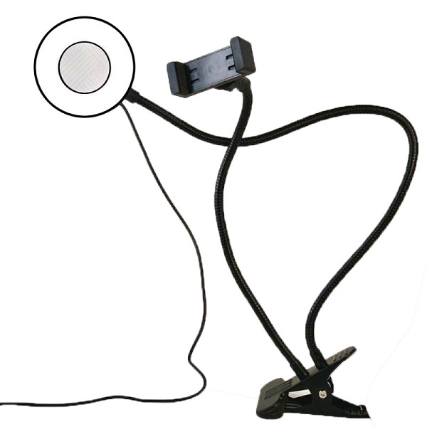رینگ لایت رو میزی گیره ای مخصوص میزهای شخصی میباشد این رینگ لایت توسط گیره به میز و یا جای مورد نظر وصل شده و دارای یک عدد گیره - یک عدد هولدر موبایل -و یک رینگ لایت دارای سه حالت آفتابی- مهتابی و سفید یخی میباشد. این کالا دارای کنترل متصل بوده که برای تغییر حالت نور و اندازه ی نور آن قابل استفاده میباشد.