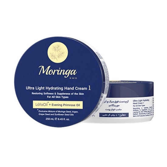 کرم دست فوق سبک و آبرسان مورینگا امو 1 با قدرت آب رسانی بسیار بالا و بافت بسیار سبک و ابریشمی، به سرعت جذب پوست شده و منجر به حفظ و تامین رطوبت آن می شود. این محصول حاوی ترکیبات مغذی است که با کمک به حفظ رطوبت در لایههای پوست و بدون ایجاد حس چربی، لطافت و جوانی پوست دست را تامین می نماید.