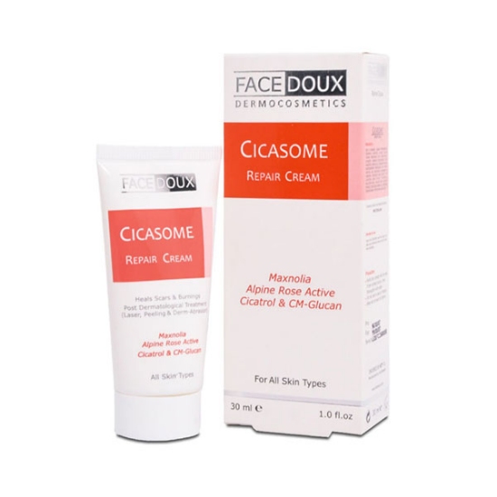 پوست انسان از لایه های متعددی تشکیل گردیده است که سطحی ترین لایه آن استراتوم کورنئوم می باشد.لیزر درمانی، لایه برداری شیمیایی، درم آبریژن، الکترولیز، اپیلاسیون و انواع سوختگی ها تغییراتی در سطح پوست ایجاد می نماید که باعث ایجاد التهاب، قرمزی، زخم، اسکار و یا عفونت های میکروبی و ویروسی می گردد. درمان با لیزر گاهاً با عوارض جانبی مانند تغییر رنگ پوست، بثورات و سوختگی و قرمزی همراه است. با بکارگیری انواع کرم ترمیم کننده می توان فرآیند درمان را تسهیل کرده و قرمزی و التهاب پوست را کاهش داد. مصرف ۱۴ روزه کرم ترمیم کننده سیکازوم فیس دوکس قبل از انجام مواردی چون لیزر، پیلینگ و درم آبریژن و… می تواند باعث کاهش عوارض ناشی از این اعمال گردد.