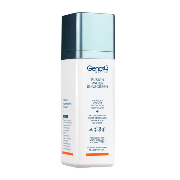 کرم ضد آفتاب ژنوبایوتیک مدل فیوژن واتر بر پایه آب بوده است و دارای بافتی بسیار سبک می باشد که به سرعت جذب پوست می شود و در برابر تعریق مقاوم است. فیلتر های قوی UV استفاده شده در این محصول از وارد شدن آسیب به ساختار DNA پوست شما و بروز آفتاب سوختگی به هنگام انواع ورزش های آبی و پیاده روی جلوگیری میکند و از پوست شما به بهترین شکل محافظت خواهد کرد. ویتامین E موجود در این محصول خنثی کننده رادیکال های آزاد می باشد و منجر به رفع تیرگی و کدری پوست شما می شود.