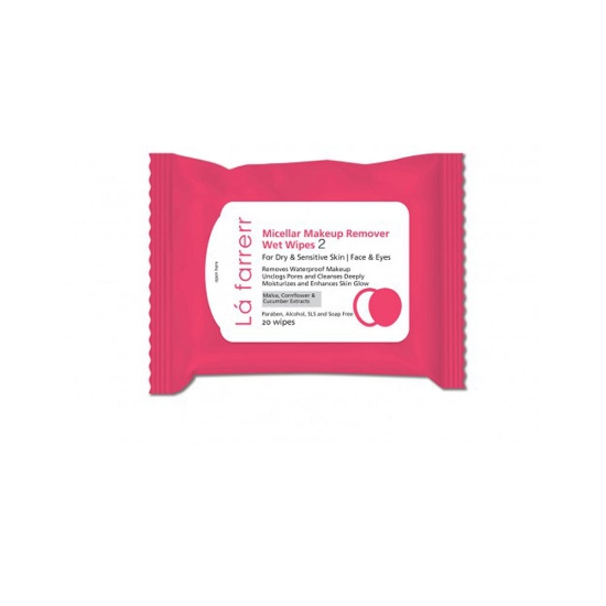 دستمال مرطوب آرايش پاک کن لافارر، بر مبنای پاک کنندگی مانند میسلار واتر ها فرموله شده است و حاوی مواد موثر در پاک کنندگی پوست از جمله عصاره گياهان پنيرک، گل گندم و خيار می باشد. این محصول علاوه بر پاک نمودن کامل آرایش، با توجه به فرمولاسیون ویژه اش ، رطوبت از دست رفته پوست را بازگردانده و موجب افزایش لطافت و شادابی پوست با کاهش علائم حساسیتی آن می شود.