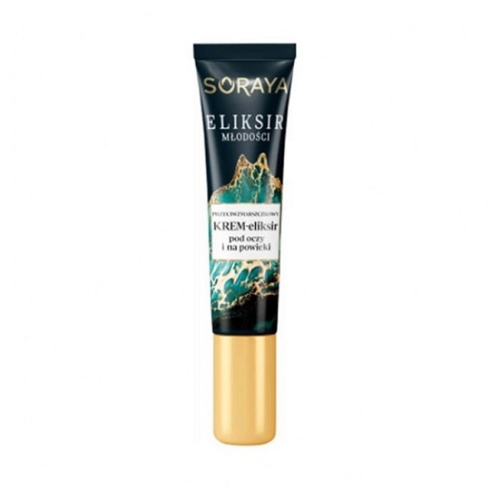 کرم دور چشم ضد چروک الکسیر جوانی ثریا محصولی از برند لهستانی ثریا است. این محصول یک کرم دور چشم برای خانم های بالغ است. این محصول داری فرمول تصفیه شده بوده که نیازهای پوست لطیف و حساس دور چشم کاملا برطرف می کند. جلبک طلایی موجود در این دور چشم یک عصاره روغنی است که سد چربی پوست را تقویت می کند. همچنین با خاصیت ضد رادیکال، سنتز کلاژن پوست را تحریک می کند. کرم دور چشم ضد چروک الکسیر ثریا اثر ضد چروک دارد و پوست دور چشم را صاف و مستحکم می نماید. مالاکیت که از دیگر ترکیبات موثر این محصول به حساب می آید یک جواهر منحصر به فرد با رنگی زیبا که رادیکال های آزاد مسئول پیری زودرس پوست را از بین می برد.