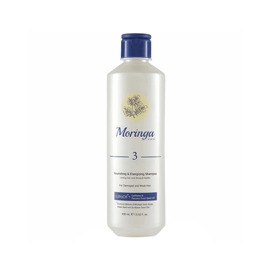 شامپو مغذی و انرژی بخش مورینگا امو کد 3 مخصوص موهای آسیب دیده و ضعیف حجم 400 میلی لیتر