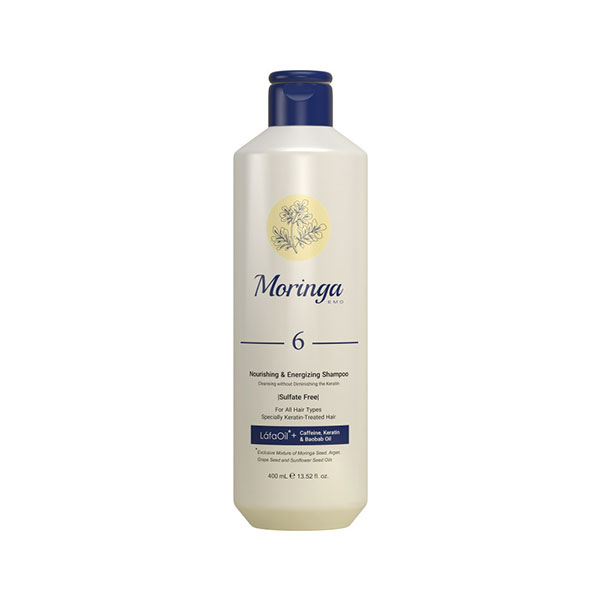 شامپو مغذی و انرژی بخش فاقد سولفات مورينگا مناسب انواع مو به ويژه كراتينه شده کد SH06 با شویندگی مؤثر به حفظ ساختار کراتین مو و افزایش ماندگاری کراتین تراپی کمک می نماید. ترکیبات به کار رفته در این محصول، باعث تقویت فولیکولها، ترمیم تارهای مو و جلوگیری از ریزش می شود. این محصول برای استحمام روزانه و افرادی که بوتاکس، اکستنشن و ریباند مو انجام دادهاند و یا دچار خشکی پوست سر و اگزما هستند نیز مناسب است.