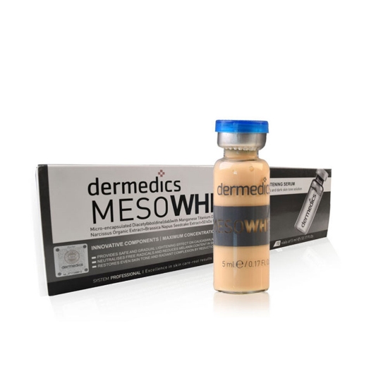مزو وایت درمدیکس MESOWHITE Dermedics یک سرم است که برای درمان های بی خطر و قدرتمند سفیدسازی پوست طراحی شده است. این محصول برای افرادی با پوستی تیره و همچنین برای کاهش لکه های صورت، رنگ پریدگی ناشی از آکنه و پیری حاصل از نور آفتاب (لکه های پیری) توصیه می شود. کوکتل مزو وایت درمدیکس دارای اثر روشن کننده فوری و تدریجی در پوست افراد آسیایی تبار، سفیدپوست و سایر قومیت ها است. دکتر وینیک مزو وایت درمدیکس را به این دسته از خانم ها و آقایانی که دنبال راه چاره می گردند معرفی می نماید.