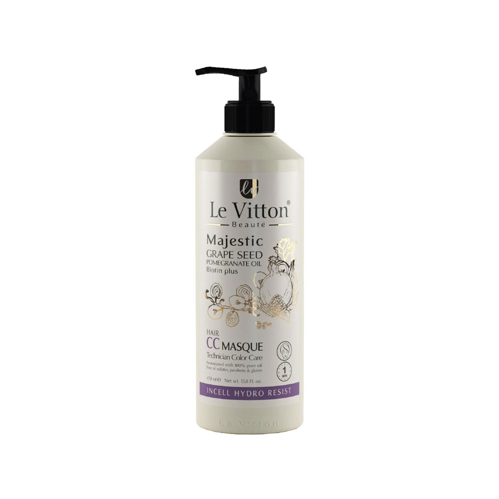 ماسک مو مغذی لویتون مدل CC Masque مخصوص موهای رنگ شده حاوی بیوتین، روغن دانه انار و انگور است که موجب افزایش درخشندگی موها، تثبیت رنگ مو، نرم کنندگی موثر و از بین رفتن خشکی و گره های سخت موهای شما می شود. ماسک مو لویتون برای حفاظت در برابر اشعه ماورای بنفش دارای فیلتر UV است و همچنین از موهایتان در برابر آلودگی های محیطی، حرارت و سایر مواد شیمیایی نیز محافظت می کند. استفاده از CC ماسک لویتون باعث تسهیل در شانه زدن و حس شادابی در موها می‌شود.