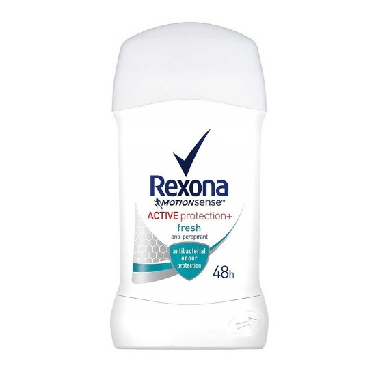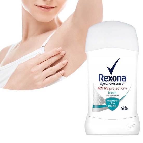 استیک «Active Protection Fresh» از برند «Rexona»(رکسونا) همانطور که از نامش پیداست مناسب برای روزهای پرفعالیت خانم ها است.این استیک با ترکیبات ضدتعریق و بدون الکل، می‌تواند به مدت ٤٨ ساعت، بوی نامطبوع عرق را از خانم ها دور نگه دارد.پس از یک استحمام عالی، استفاده از اکتیو پروتکشن کمک می‌کند تا در طول روز بتوانید به‌راحتی به فعالیت بپردازید؛ بدون آنکه زیر بغلتان از عرقی بدبو تر شود. اکشن پروتکشن فرش اثری از لک و سفیدی نیز بر جای نمی‌گذارد.