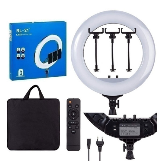 تکنولوژی پیشرفته ساخت لامپ های این دستگاه SMD POWER SAVING میباشد که قدرت نوردهی بالا با مصرف برق کمتر نسبت به سایر مدل ها را به ارمغان اورده است . پشتیبانی از ۲ پورت USB در طراحی این دستگاه این امکان را فراهم نموده تا در حین فیلمبرداری های طولانی مدت دیگر نگران شارژ تلفن همراه خود نباشید. رینگ لایت RL-21 54cm دارای ۲ دیمر در پنل جلویی دستگاه میباشد که امکان دسترسی به تنظیمات حین فیلمبرداری رو برای کاربر آسان نموده است . وجود ریموت کنترل با برد بیش از ۵ متر از دیگر امکانات این دستگاه میباشپ که کنترل دستگاه  را از راه دور فراهم می سازد. در طراحی این دستگاه از ۳ هولدر موبایل در حلقه داخلی رینگ لایت استفاده شده است .