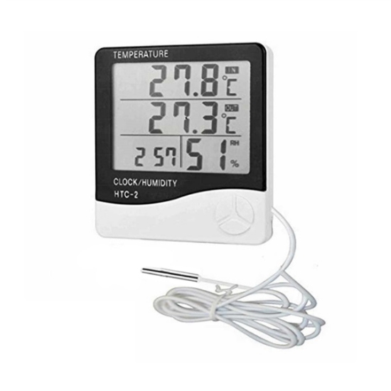 دماسنج رطوبت سنج برای اندازه گیری دما و رطوبت محیط بکار می رود. این دماسنج دیجیتالی محیطی بصورت رومیزی و یا دیواری قابل استفاده می باشد. این رطوبت سنج دیجیتال محیط دارای تاریخ و ساعت و حافظه ماکزیمم و مینیمم می باشد. دستگاه با یک باتری نیم قلمی چندین ماه تغذیه می شود. رنج اندازه گیری دما ۱۰- تا ۵۰ درجه سلسیوس- رنج اندازه گیری رطوبت %۱۰ تا %۹۹ درصد- دقت اندازه گیری دما ±۱۰C- دقت اندازه گیری رطوبت %±۵- ابعاد ۴۸mm * ۲۸,۶mm * ۱۵.۲mm- ولتاژ ۱.۵v نوع باتری AAA وجود یک رطوبت سنج و دما سنج برای یک اکستنشن کار و مژه کار در سالن مربوطه الزامی میباشد چرا که با این وجود راحت میتوان دمای محیط را مناسب انجام کار قرار داد و رساند و همچنین دمای مورد نیاز برای اکستنشن و نگهداری و انجام آن را نیز تامین کرد.