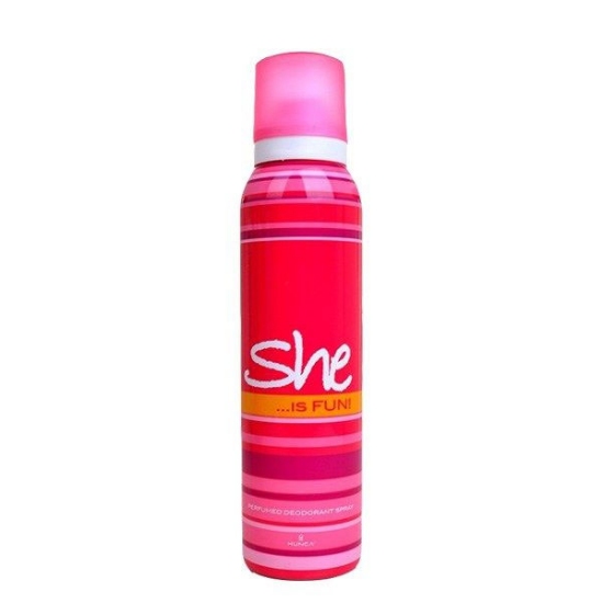 اسپری زنانه شی مدل Fun با حجم 150 میلی‌لیتری محصول کشور ترکیه است. اسپری شی ایز فان با بوی شیرینش، برای مصارف روزانه‌ی خانم‌ها بسیار مناسب به نظر می‌آید. نکته‌ی اصلی درباره‌ی این اسپری، قابلیت استفاده‌ی آن در تمامی فصول سال است.