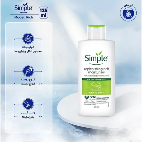 بنابراین برای انواع پوست، حتی پوست‌های حساس، مناسب می باشد. بافت سبک و قابلیت جذب بالای این کرم، آن را به یک مرطوب کننده عالی تبدیل می‌ نماید که پوست را نرم و لطیف می‌سازد و تا 12 ساعت آبرسانی می‌ نماید. کرم آبرسان سیمپل مدل Rich، که در هلند تولید شده و دارای مجوز از سازمان غذا و دارو است، اطمینان از کیفیت و ایمنی را به همراه دارد. جنس محفظه پلاستیکی و نوع محفظه تیوپی، استفاده از آن را آسان و بهداشتی می‌ سازد. این کرم، با تأکید بر مراقبت ملایم و مؤثر، گزینه ای عالی برای مراقبت روزانه از پوست می باشد.