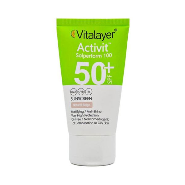 کرم ضد آفتاب ويتالير SPF50 پوست چرب رنگ بژ طبيعي با مراقبت ومحافظت کامل وفاکتور محافظتی SPF50از پوست در برابر اشعه‌های مضر UVA و UVB و IR به جلوگیری از آفتاب سوختگی و ایجاد لک می‌پردازد.